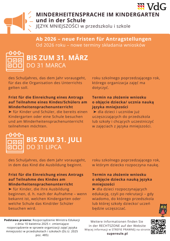 Seit diesem Schuljahr gilt eine neue Verordnung des Bildungsministeriums. Sie enthält klare Regeln für die Fristen zur Einreichung von Anträgen auf Teilnahme eines Kindes am Unterricht Deutsch als Minderheitensprache.